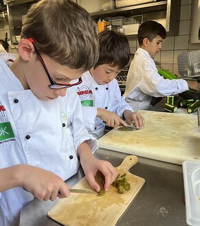 Am Freitag, 23.06.2023 war die Schlemmerbande zu Gast im Restaurant Casanova in Weilheim/Teck. Der Chefkoch Sara Stefano begrüßte die zehn Kids und hielt gleich zur Begrüßung einen Seeteufel in der Hand. Die Miniköche waren überrascht über diesen großen Fisch, der 2.700 Gramm wog. David durfte das erste Mal ein Filetiermesser in der Hand halten und einen Seeteufel ausnehmen. Nach und nach wurden auch die anderen Kids mutiger und trauten sich noch zwei weitere Seeteufel zu filetieren. Im Mittelpunkt des Kochworkshops stand der Klassiker der italienischen Küche: „Tagliatelle al Sugo mit Tiramisu“.