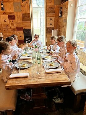 Am Freitag, 17.05.2024 trafen sich die Kinder der Schlemmerbande im Casanova in Weilheim/Teck. Jedes Jahr dürfen die Miniköche bei dem Italiener kochen und anschließend im historischen Ambiente ihr selbst gekochtes Gericht verspeisen. Diesmal stand auf dem Programm: Steinbutt filetieren, herstellen eines Nudelteigs für Ravioli mit Ricotta-Spinat Füllung, einer Parmesan-Butter Soße und Blaubeer-Muffins. Der Chefkoch Stefano Sara erklärte ausführlich, wie man einen Raubfisch filetiert. Anschließend traute sich Greta an den Plattfisch. Danach ging es an die Herstellung des Nudelteigs für die Ravioli und die Ricotta-Spinat-Füllung. Nach dem Fertigstellen der Pasta wurde die vorbereitete Füllung in eine Spritztüte abgefüllt und auf der Pasta platziert. Die kleinen Köche durften die Ravioli rund ausstechen und in kochendem Wasser 5-6 Minuten köcheln lassen. Auch die Zubereitung der Blaubeer-Muffins machte den Kindern großen Spaß, da jeder einzelne Cupcake individuell gestaltet werden durfte. Zum Schluss durfte die Schlemmerbande ihr selbst hergestelltes Gericht im Restaurant in gemütlicher Atmosphäre genießen.