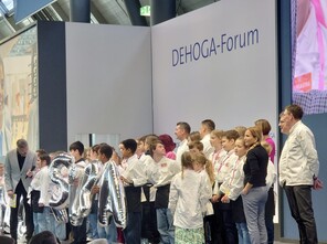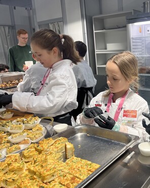 Die Aufregung war den jungen Köchen deutlich anzumerken, als sie in den frühen Morgenstunden das Gelände der Intergastra in Stuttgart betraten. Hinter den Kulissen wurde geschnippelt, angerichtet und dekoriert. Mit viel Teamgeist und guter Laune entstand ein abwechslungsreiches Buffet, das nicht nur optisch, sondern auch geschmacklich großen Anklang fand. Besonders stolz präsentierten die Kinder ihre Gemüsequiche sowie liebevoll belegte Brötchen und frisch gebackene Muffins. Die Leckereien wurden von den Kindern an die Gäste verteilt. Ein Höhepunkt des Tages war der Auftritt auf der Dehoga-Bühne. Vor Publikum berichteten die Kinder selbstbewusst, wie sie neue Rezepte ausprobieren, den Umgang mit Lebensmitteln lernen und als Team zusammenarbeiten. Auch Fragen zu ihren Lieblingsgerichten und zu besonderen Momenten im Projekt beantworteten sie mit strahlenden Gesichtern. Besonders stolz war die Projektleitung Josephine Dangelmayr auf ihre Köche und freut sich bereits auf das nächste Treffen.